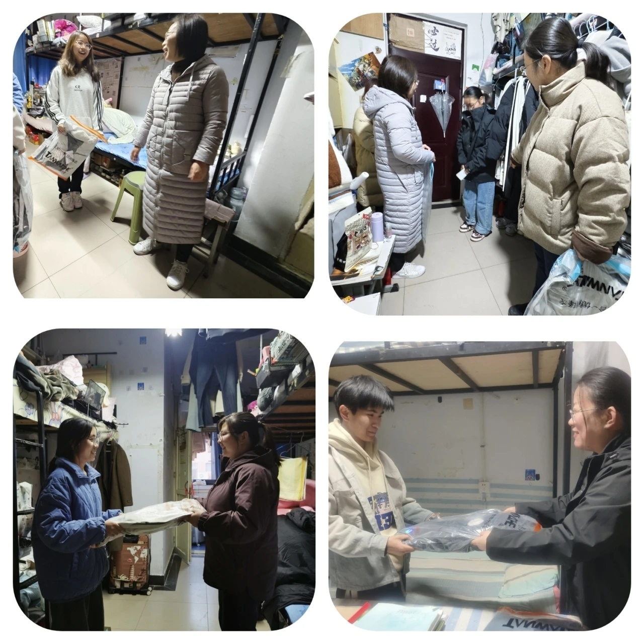 冬意渐浓,冷意渐深。伴随郑州低温雨雪冰冻天气的来临,12月5日,我院举行了“情系学生,暖心送衣”冬季棉衣发放活动。河南工业贸易职业学院党委副书记、校长曹利强、校党委副书记柴瑞帅,粮食工程学院党总支书记赵恒昌、副院长张庆霞、党总支副书记卢宁、团总支书记张震、辅导员王同婷、牛芳芳、郭洁、郝小倩、杨光胜老师深入学生宿舍,共同参与发放活动,为特困生发放了御寒衣物,让受助同学在寒冷的冬天感受到了学院大家庭的温暖。