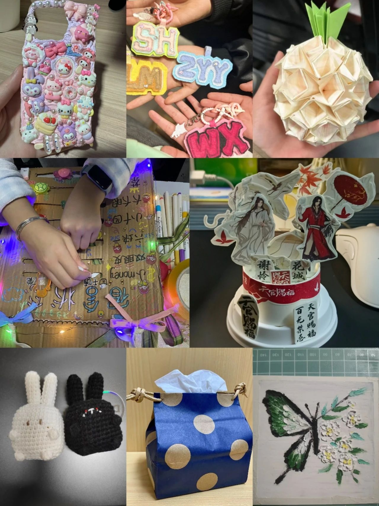 在手工作品征集活动中,粮食工程学院的同学们展现出非凡的创造力与动手能力,用双手打造出一件件精美的手工作品。有色彩明快、图案别致的手机壳;可爱精致的字母毛毡钥匙扣;造型逼真的折纸菠萝;笔触细腻、栩栩如生的蝴蝶油画。从毛毡小挂件,到个性纸巾盒;从钩织的萌趣小兔,到满是可爱元素的手机壳……作品涵盖绘画、编织、手工制作等多种形式,巧妙将创意与劳动相结合。每一件作品都凝聚着同学们的心血,是劳动与创意碰撞出的璀璨火花。