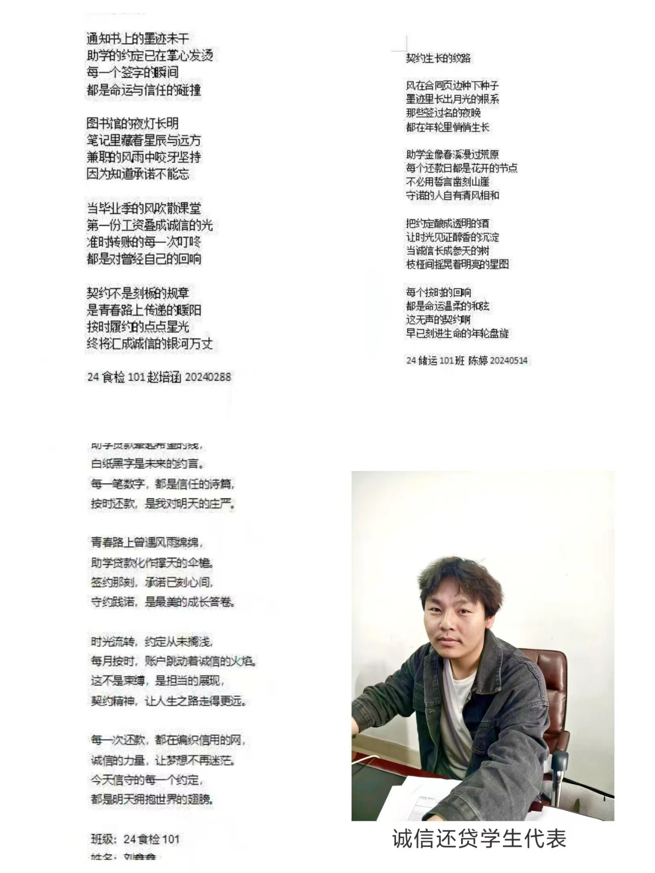 诚信还贷是资助政策良性循环的保障。诚信,是为人之本,在还贷方面尤为重要。粮食学校举行“诗词中的契约精神”活动,鼓励同学们积极参与,使同学们明白诚信的重要性。同时树立诚信楷模,积极培育诚信还贷的良好氛围,毛维同学凭借按时还贷、坚守信用的举动,成为大家学习的榜样。让诚信文化在校园中生根发芽,让每一位粮食学子都能成为诚信的践行者和传播者。