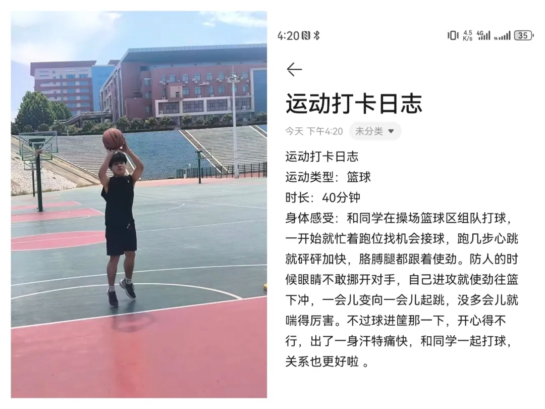 从运动APP的科学数据,到手写日志的细腻感悟,再到运动场景照片的鲜活呈现,同学们积极践行“每周不少于3次、每次30分钟以上”的锻炼要求,用行动落实“养成教育月”理念。这些记录不仅是汗水的见证,更是德智体美劳全面发展的生动实践。期待更多同学以体育为翼,在“养成教育月”中锤炼体魄、养成习惯,让青春因运动熠熠生辉!