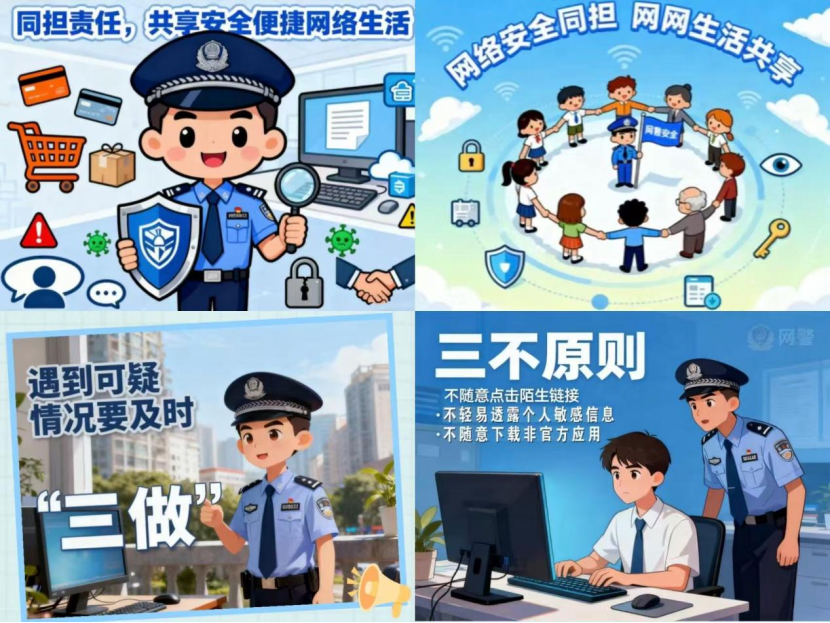 通过公众号转载官方相关文章和宣传展板形式开展网络安全知识宣传,点明互联网便利背后存在数据泄露、病毒攻击等安全风险,强调网络安全是需要全社会参与的“必修课”;日常上网要牢记“三不原则”——不随意点击陌生链接、不轻易透露个人敏感信息、不随意下载非官方应用;说明遇到可疑情况要及时“三做”:冻结账户改密码、举报虚假信息和非法链接,最后号召大家主动学习网络安全知识,“同担”责任、守护“共享”的安全网络家园。