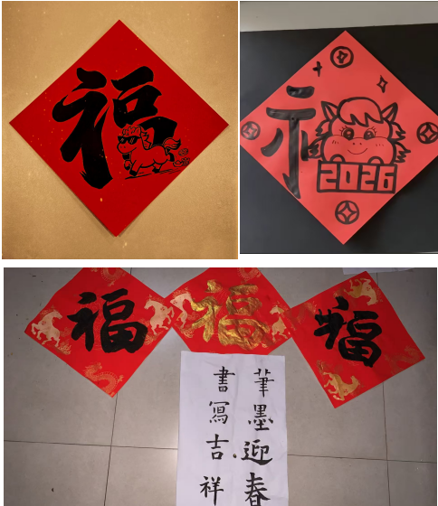 为推动中华优秀传统文化实现创造性转化与创新性发展,2026年1月,我院在“传统文化教育月”期间开展“笔墨迎春,书写吉祥”书画体验活动,活动以线上形式开展,适配寒假学生居家场景,面向24级与25级学生发起号召,吸引同学们积极响应、自主参与,以笔墨书写“福”字为核心形式,搭建线上展示与交流平台,践行传统文化传承。
