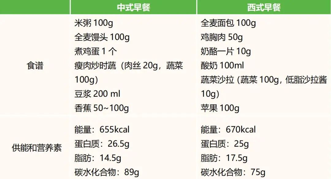 早餐的食物应包括谷薯类、蔬菜水果、动物性食物、奶豆坚果等4类食物。早餐食谱举例见表1。