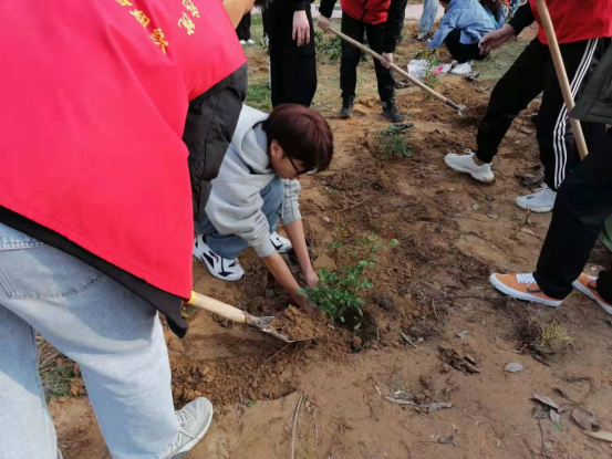 在志愿者大队部的精心策划、多方协调下,植树活动顺利开展。2021年3月11日,志愿者成员一大早就准备妥当,带着对春天的祝福开启了植树活动。
