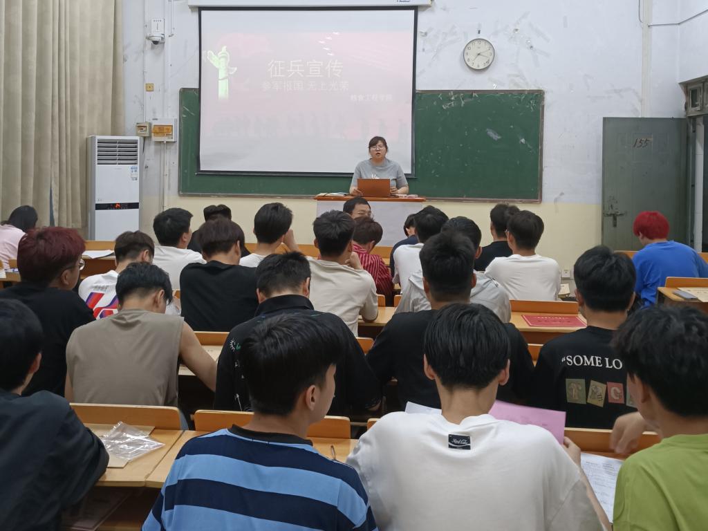 我院征兵宣传专员牛芳芳老师以国防的重要性为切入点,从征兵工作的意义、基本条件、组织流程、优待政策四个方面详细解读了大学生应征入伍的政策法规。同时她强调征召大学生参军入伍是党中央、国务院、中央军委作出的重大战略决策,对改善兵员素质、提高部队战斗力、促进青年学生的成长成才具有重要意义,向全体在校生具体介绍了报名征兵的流程。