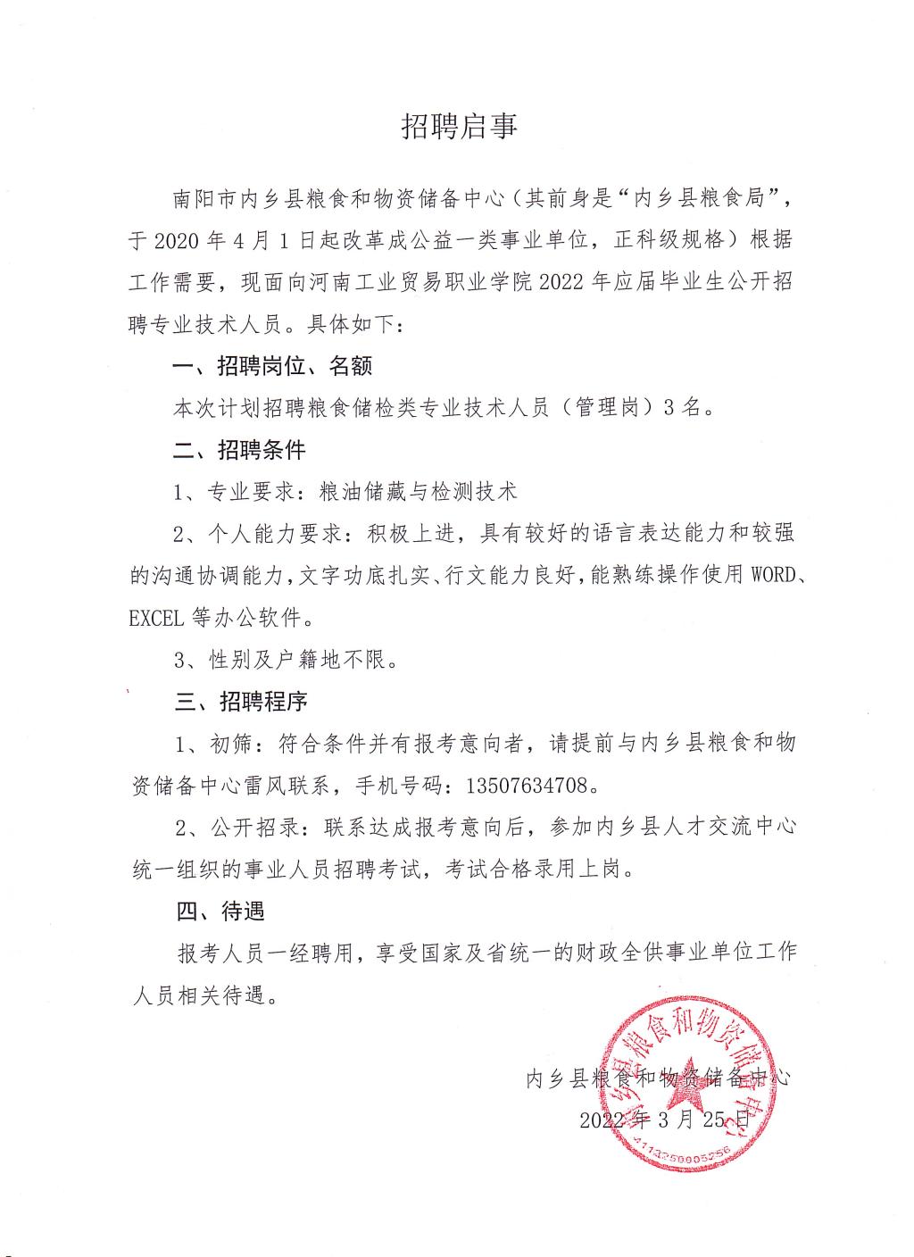 南阳市内乡县粮食和物资储备中心招聘启事
