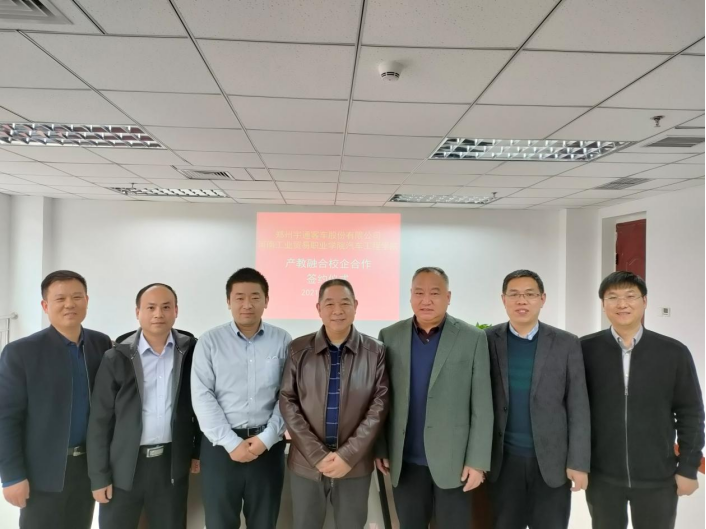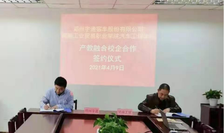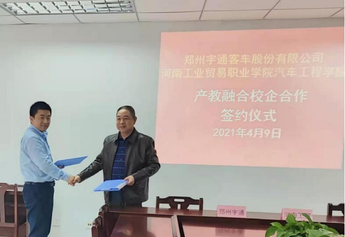 阳春布德泽,万物生光辉。2021年4月9日,汽车工程学院与郑州宇通客车股份有限公司举行了校企战略合作签约仪式。我校校企合作与国际交流处处长陆积华、汽车工程学院院长周建仁、党总支书记高鸿翔,宇通客车股份有限公司人力资源经理郭永利、技能培训经理薛川等参加了签约仪式。仪式在图书馆B9005室举行,由周建仁主持。