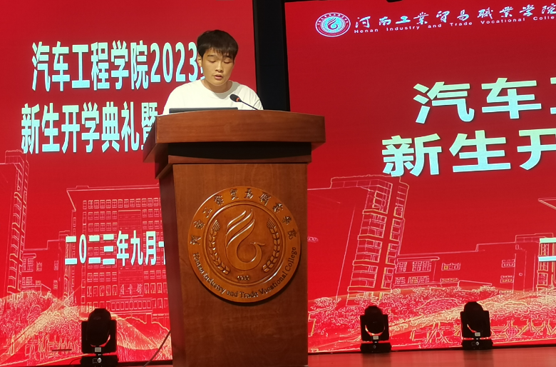 23智联102班史狄代表2023级新生发言,他表达了对大学生活的向往和自己对青年人的“使命与担当”的理解,青年人肩负着民族复兴的重任,应保持心怀天下的广阔胸襟。他祝愿大家在汽车工程学院大家庭中努力拼搏,实现价值,让内心梦想的种子开花结果,聚木成林。