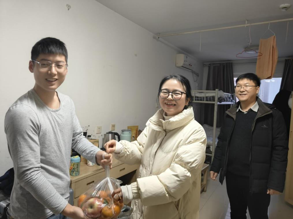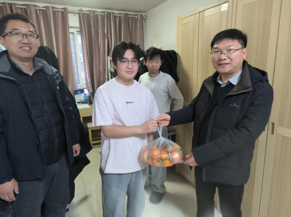 在实习师生慰问环节,走访慰问组到企业的职工宿舍慰问实习师生。陈冰赛详细了解同学们的实习日常、生活保障以及实际困难,同时为实习师生送上慰问品,传递学校的关怀与温暖。