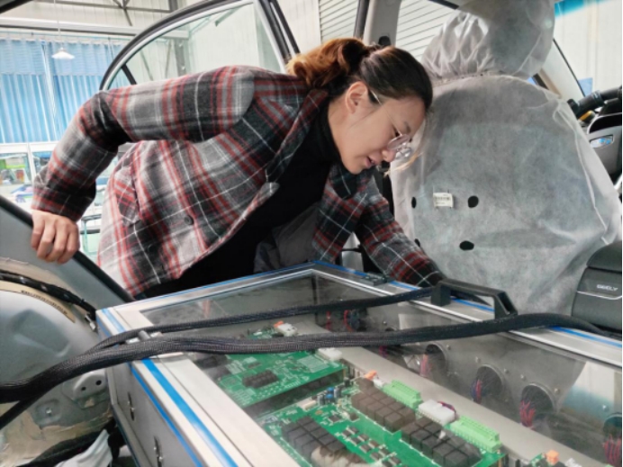 罗志华老师和左冬晓老师认真查看汽车线路。