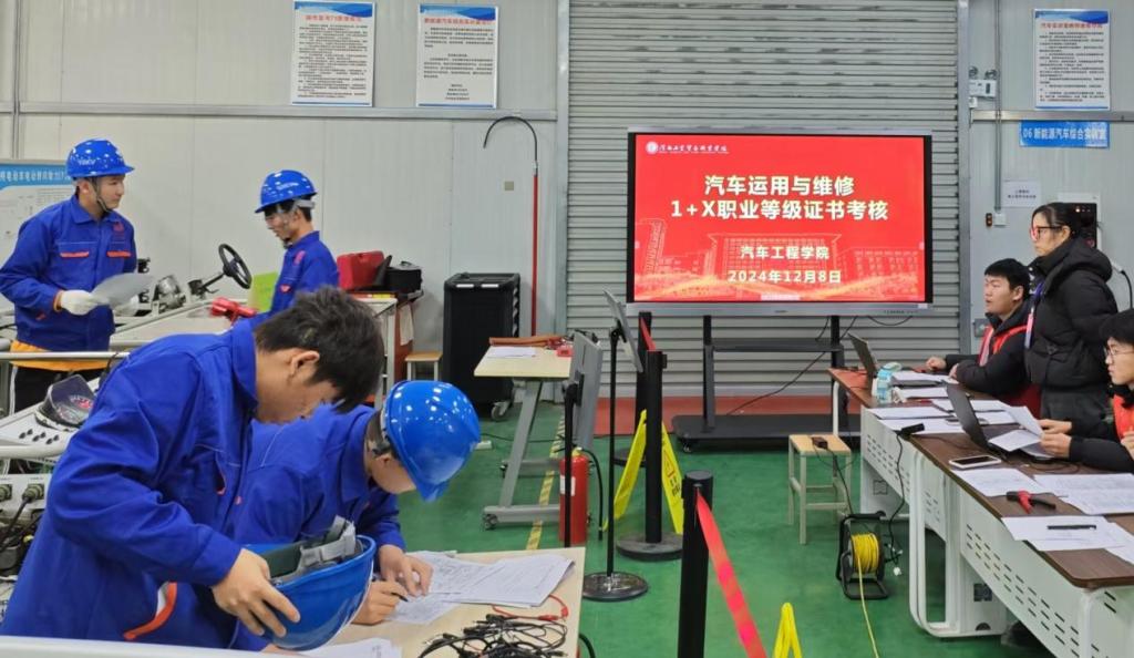 在全民技能振兴工程高技能人才培养基地助力下,汽车工程学院在 12 月6—9 日在人才培养基地成功进行了汽车运用与维修和智能新能源汽车 1+X 职业等级证书考评,考评500余人次。