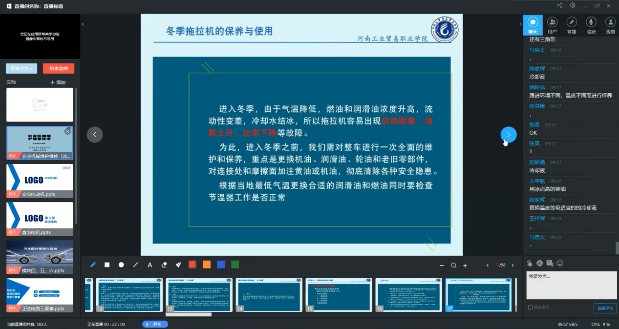 疫情无情、教育有爱。汽车工程学院于12月3日开展了“常用农业机械维护维修”和“带你认识新能源汽车”两场线上培训。此次线上培训校地双方都非常重视,参加培训人数1100多人次,培训老师认真而专业,线上互动积极而热烈,培训结束后学员们纷纷留言表示收获和感谢。