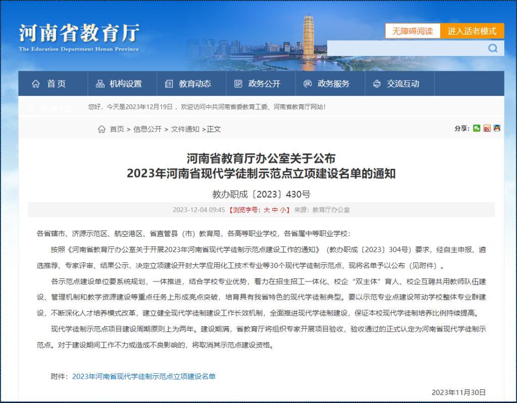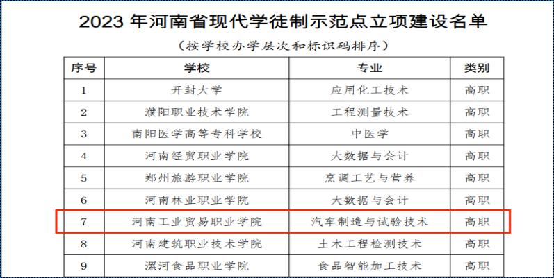 河南省教育厅印发《关于公布2023年河南省现代学徒制示范点立项建设名单的通知》(教办职成〔2023〕430号),我校汽车制造与试验技术专业入选2023年河南省现代学徒制示范点立项建设名单。