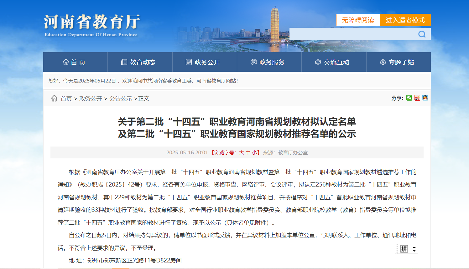 近日,河南省教育厅公示了第二批“十四五”职业教育河南省规划教材拟认定名单及第二批“十四五”职业教育国家规划教材拟推荐名单。我院杨慧荣副教授主编的《智能网联汽车技术》、张清郁教授主编的《二手车鉴定与评估》两本教材成功入选第二批"十四五"职业教育河南省规划教材。《智能网联汽车技术》更获推第二批"十四五"职业教育国家规划教材。