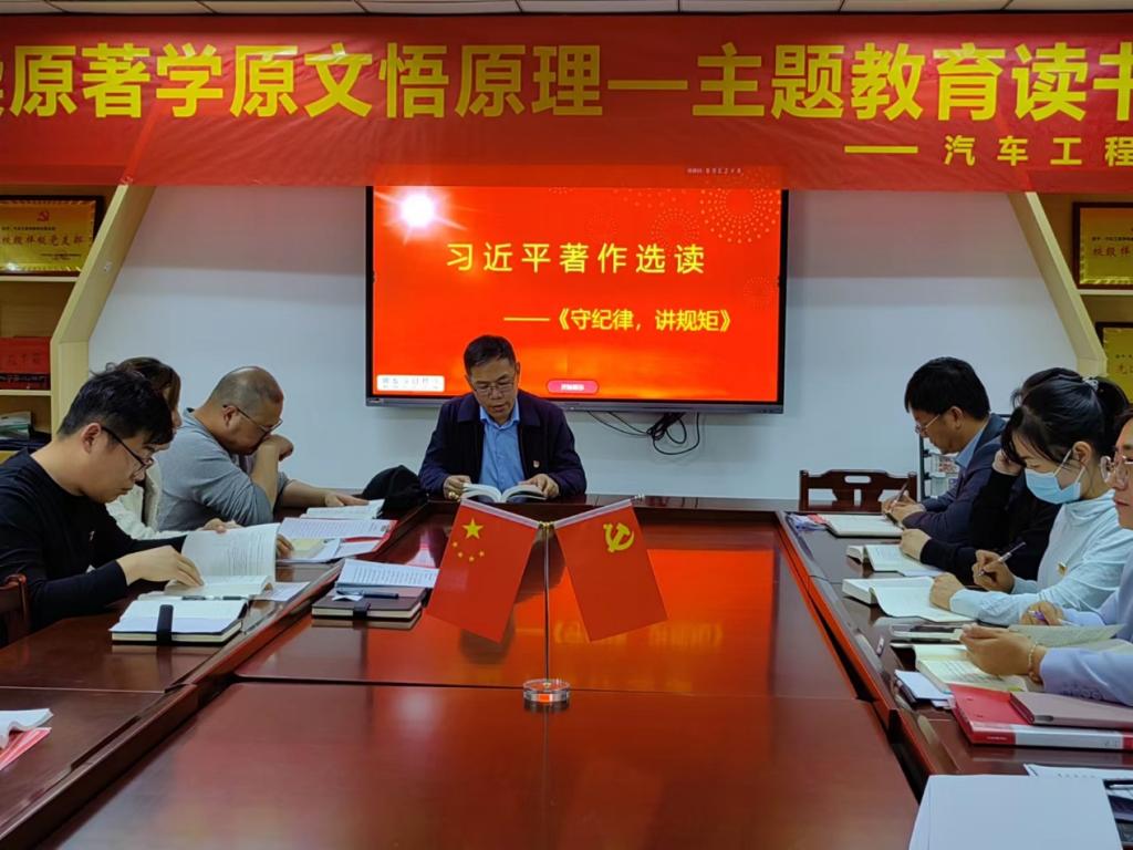 首先,汽车工程学院党总支书记高鸿翔领学了《习近平著作选读·第一卷》之“守纪律,讲规矩”。高鸿翔强调,人不以规矩则废,党不以规矩则乱,领导干部违纪往往是从破坏规矩开始的,讲规矩是对党员、干部党性的重要考验,是对党员、干部对党忠诚度的重要检验。高鸿翔指出,我们要常读红色经典、领悟原文要旨,结合实际工作、相互交谈心得,让读书成为习惯、让原著浸润初心,推动工作往深里走、往实里走。