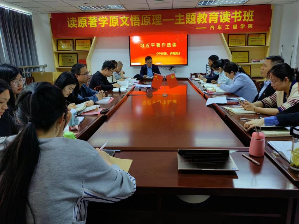 为深入学习贯彻习近平新时代中国特色社会主义思想,营造“爱读书、善读书”的良好氛围,加强广大党员对原文原著的阅读、理解、领悟能力, 2023年5月9日,汽车工程学院党总支在图书馆B9005举办了“读原著学原文悟原理”的主题教育读书班。活动由汽车工程学院党总支副书记周淑娟主持,学院全体党员参加。