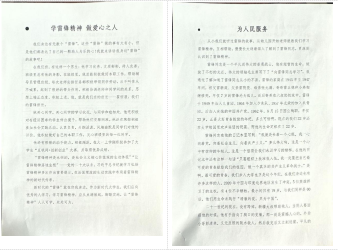 此外,为了弘扬雷锋精神,传承中华优秀传统文化,激励广大青年学子将钉子精神内化于心,外化于行,将雷锋精神在当代的意义的思考诉诸笔下,我院还开展弘扬雷锋精神主题征文活动。同学们积极响应,纷纷投稿,共收到来稿30余篇。