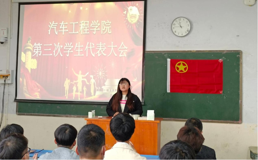 青春正当时,奋进新时代。经河南工业贸易职业学院汽车工程学院总支部委员会批准,汽车工程学院第三次学生代表大会于2021 年10月26日下午3:00在龙湖校区1406 教室顺利召开。出席本次代表大会的有我院党总支书记高鸿翔、团总支书记校金龙、专职辅导员汪福杰以及各班学生代表。
