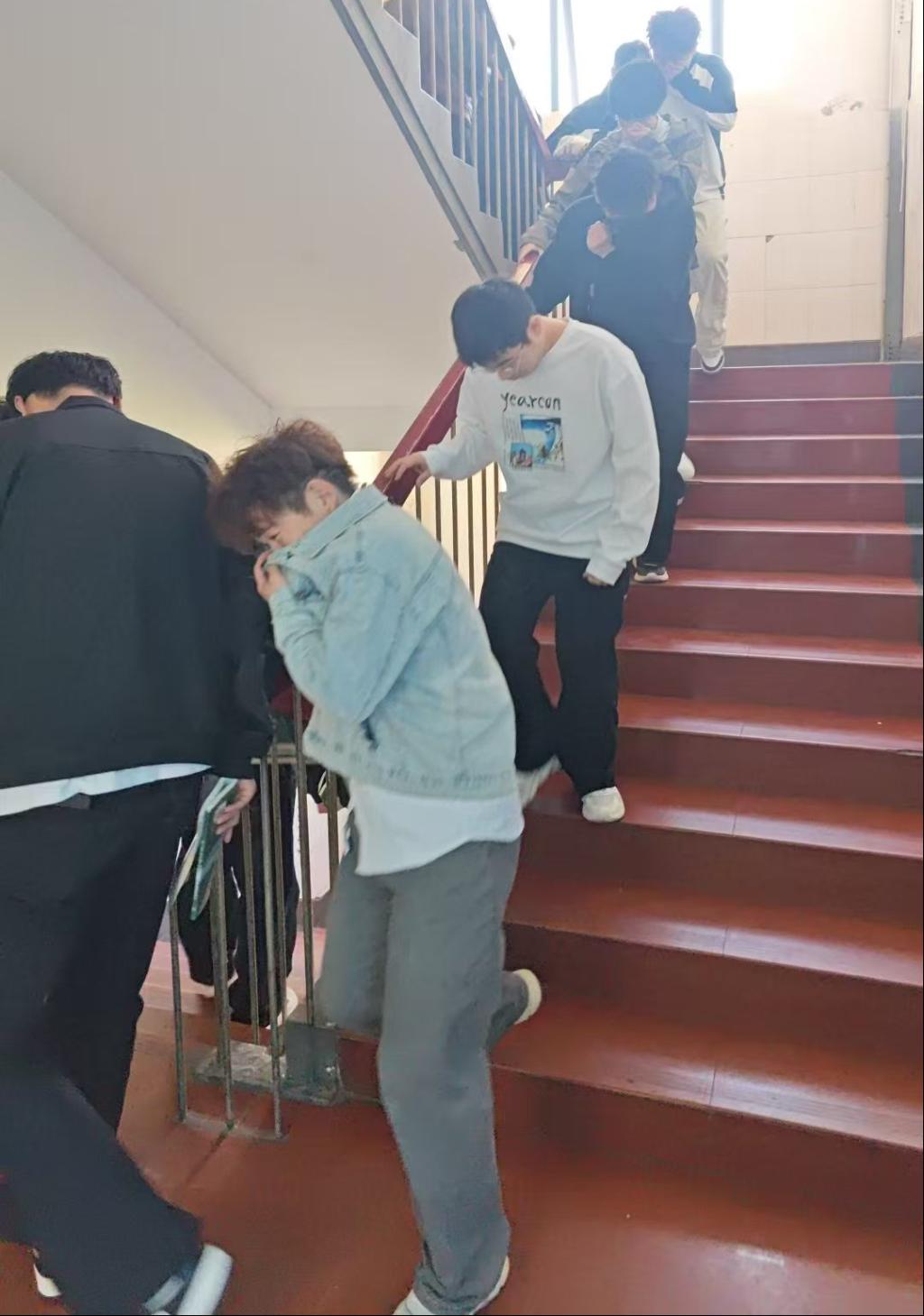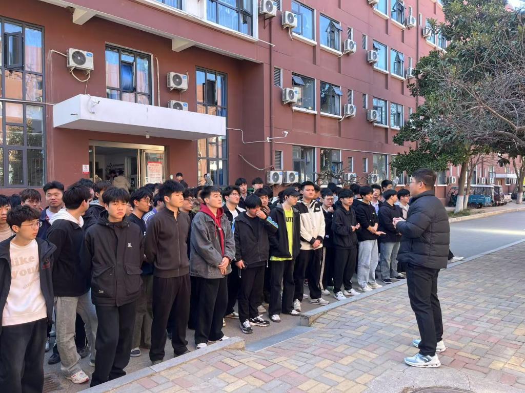 中午12:40分,六楼安全警示信号响起,消防演练正式启动。各班辅导员迅速组织学生按照预定逃生路线,弯腰捂鼻、快速有序撤离至操场安全区域。整个疏散过程用时 2 分 30 秒,全体人员安全抵达指定地点,无拥挤、推搡现象。