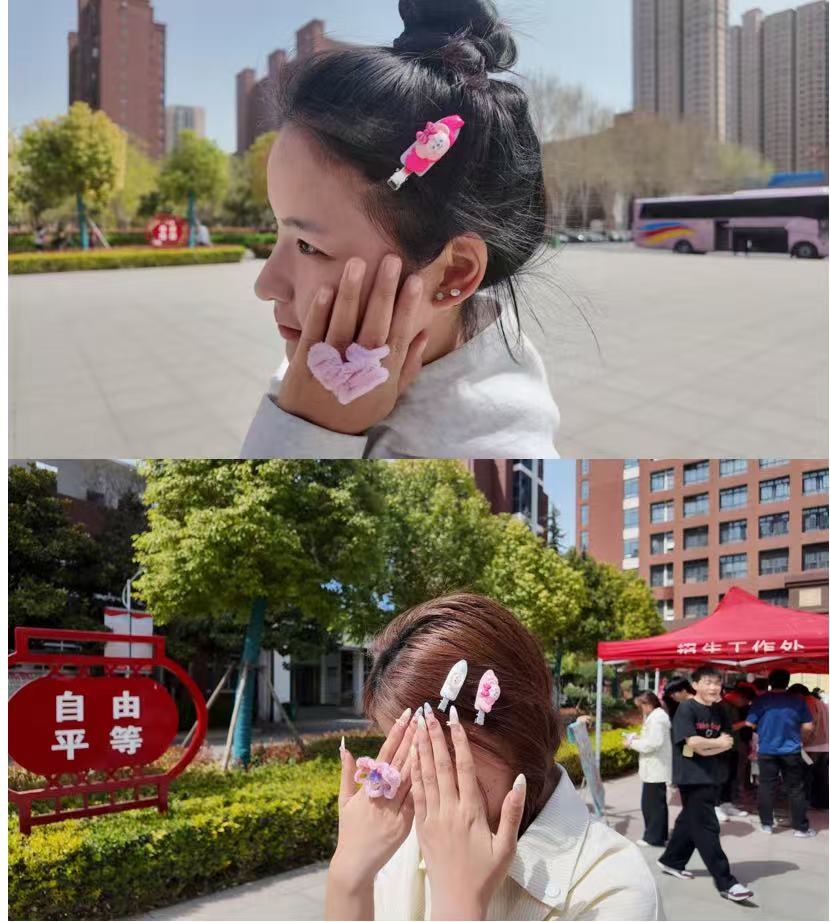DIY发卡区同样人气爆棚。同学们专注地挑选着喜爱的小珠子、彩色丝带等材料,精心搭配,制作出一个个精美发卡。这些发卡戴在头上,让同学们瞬间增添了几分俏皮与可爱。大家相互欣赏、彼此夸赞,现场满是欢声笑语,温馨的氛围弥漫在空气中。