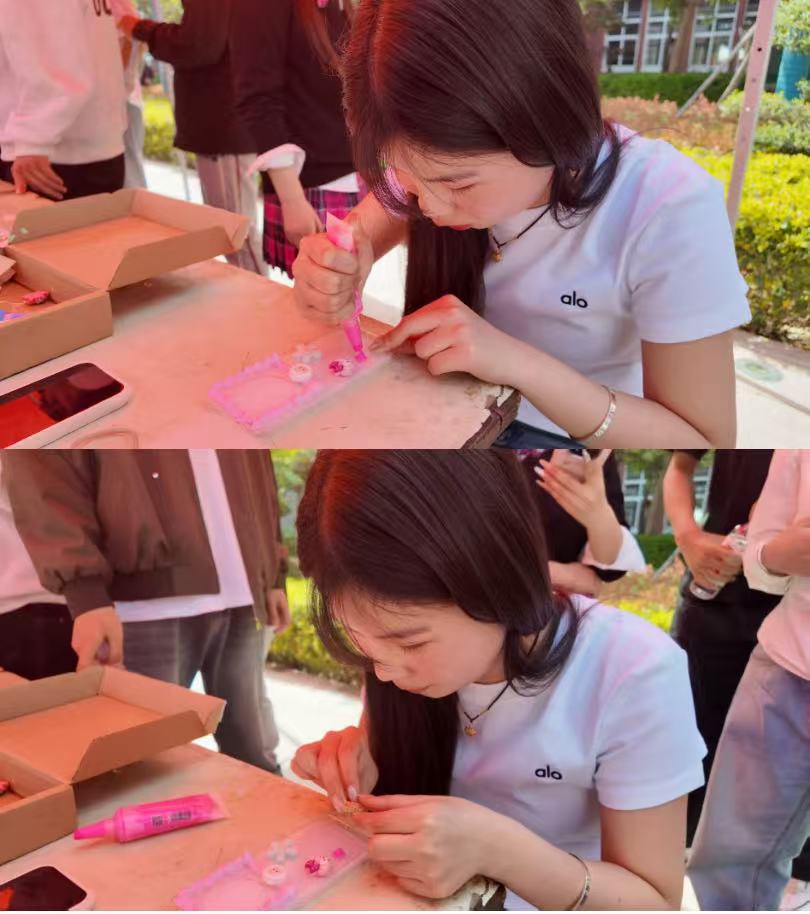 DIY手机壳区域堪称创意的孵化地。五颜六色的奶油胶在同学们手中宛如灵动的画笔,被轻轻挤出,勾勒出可爱的卡通形象、浪漫的心形图案或是抽象的艺术线条。原本普普通通的透明手机壳,在同学们的巧手下,眨眼间就完成了华丽变身,成为了充满个性的时尚单品。