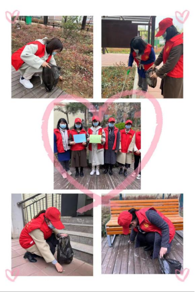 第三小组负责清洁维护花园、操场、亭子以及卫生死角,将隐藏在花丛中、椅子下、砖缝中不易清理的烟头、纸屑进行清理,并手持宣传标语开展文明校园宣传。