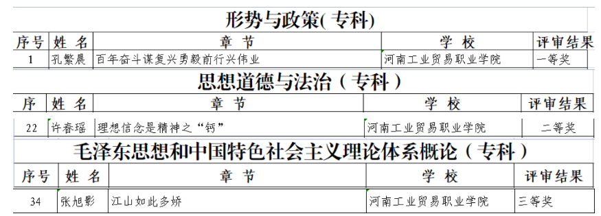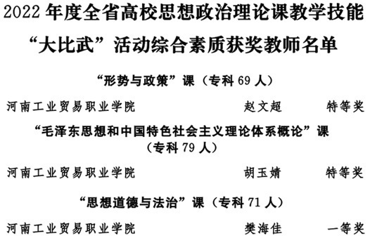 在2022年河南省高校思想政治理论课教学技能“大比武”活动中,我院赵文超老师、胡玉婧老师在综合素质、教学展示环节中分别获得两项特等奖,樊海佳老师获得两项一等奖。