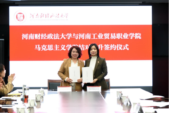 签约仪式上,靳翠梅与河南财经政法大学马克思主义学院院长郑卫丽签署结对提升协议。根据协议内容,双方将围绕集体备课、实践教学、科研合作等领域展开深度联动,通过资源共享、师资互派、联合课题攻关等方式,推动思政课程改革与马克思主义学院标准化建设。