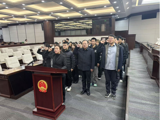 在讲解员的引导下,师生们先后参观了“中华人民共和国宪法”“人民代表大会制度在郑州的生动实践”“代表工作”等主题展厅,系统了解了宪法发展历程与人大制度的运行实践。随后,师生走进市人大常委会会议厅,举行模拟宪法宣誓仪式,在庄严氛围中进一步深化了对宪法精神的理解,强化了自身的责任与使命意识。活动特别设置了知识竞答环节,主持人围绕宪法原则、公民权利义务、人大制度运作等内容现场提问,师生踊跃抢答,现场气氛热烈、互动积极。