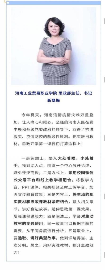 8月26日,靳翠梅应河南省教育厅思政处“豫教思语”约稿,作为河南10位高校马克思主义学院院长之一,就如何“把灾难当教材,与祖国共成长”,做好青年学子的思想引领,上好思政开学第一课谈了自己的观点。