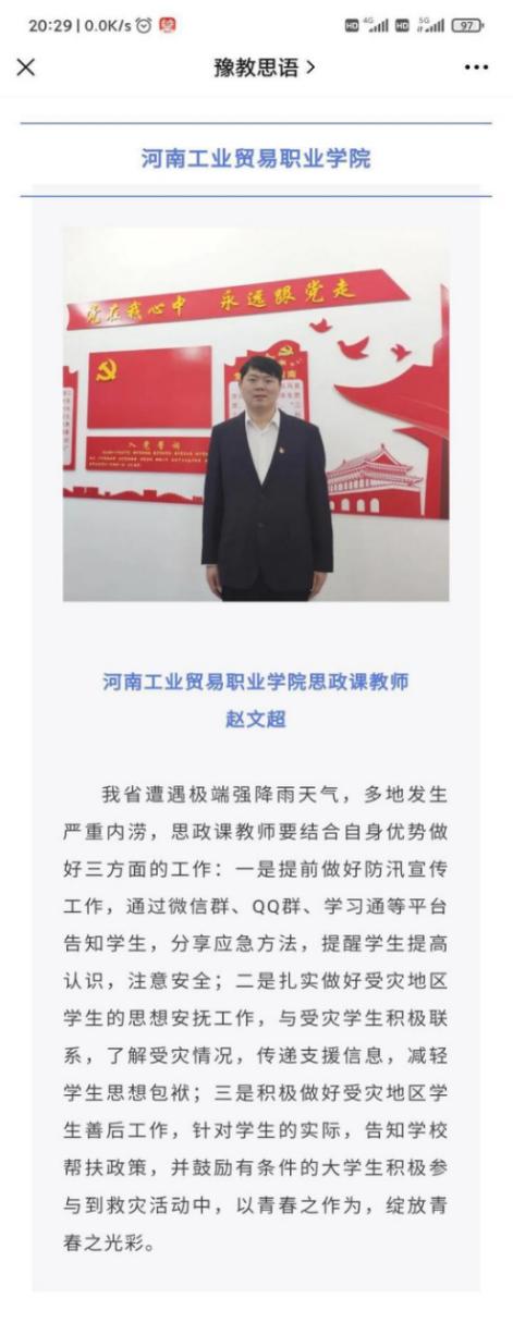 8月5日,赵文超应河南省教育厅思政处“豫教思语”约稿,作为河南34位高校思政课教师之一,就如何讲好防汛救灾这堂思政大课发表了自己的见解。