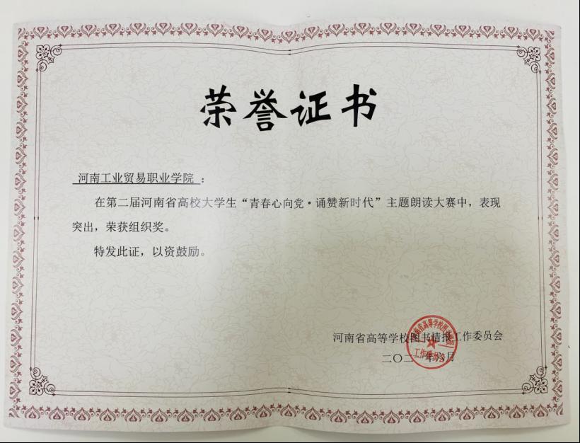 我校图书馆在第二届河南省高校大学生“青春向党.诵赞新时代”主题朗读大赛中,表现突出,荣获组织奖。