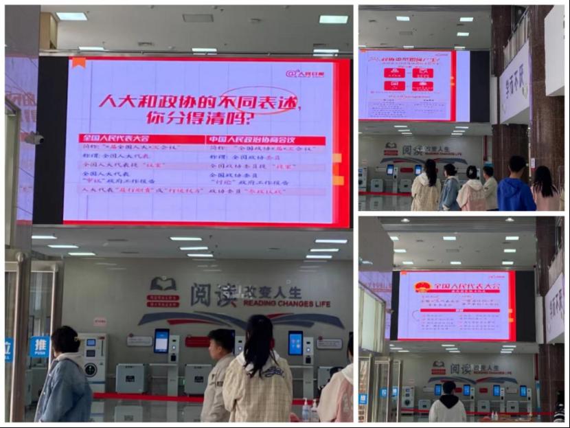 在“两会”召开前夕,图书馆利用馆内LED大屏进行“两会”知识宣传。关于“全国两会是哪两个会?”、“人大和政协的区别?”等知识,通过图片形式进行展播,引起了入馆读者的驻足观看,给读者提供了一个及时、直观了解“两会”信息的平台。