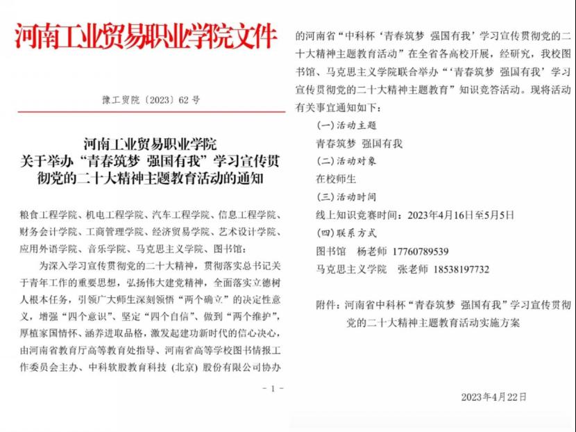 为深入学习宣传贯彻党的二十大精神,贯彻落实习近平总书记关于青年工作的重要思想,弘扬伟大建党精神,全面落实立德树人根本任务,引领广大师生深刻领悟“两个确立”的决定性意义,厚植家国情怀、涵养进取品格,激发起建功新时代的信心决心,图书馆联合马克思主义学院,于2023年4月16日至5月5日,组织举办了学习宣传贯彻党的二十大精神主题教育知识竞答活动。