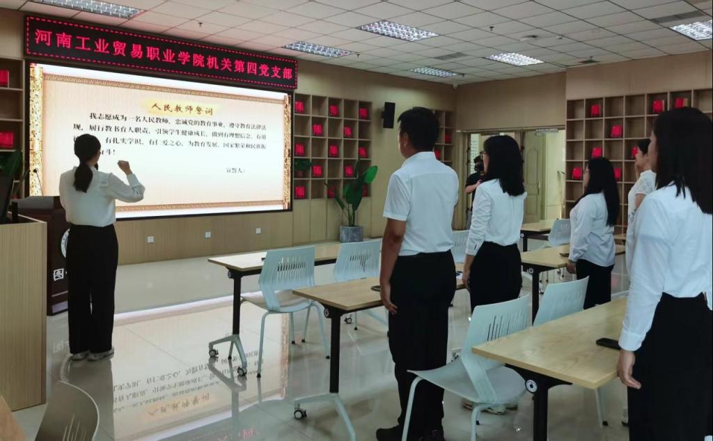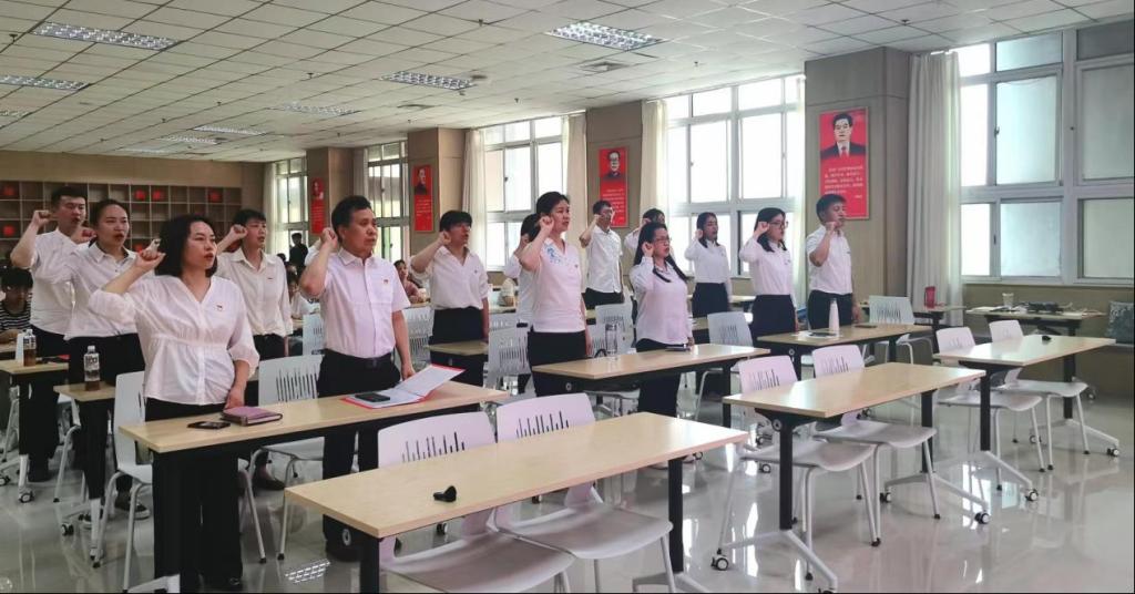 全体教师党员整装肃立,目光坚毅,在王珊同志的带领下,高举右手,庄严宣誓。一个支部一面旗,一名党员一盏灯。铿锵有力的宣誓,让在场的每一位党员干部重温了自己加入中国共产党时的庄严承诺。