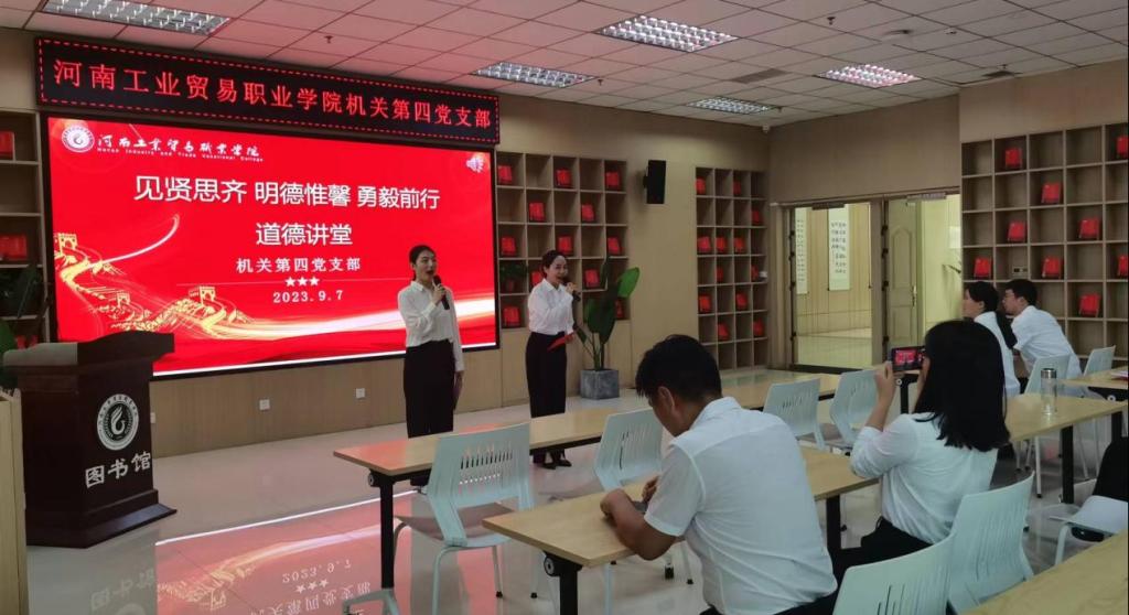 2023年9月7日下午,机关第四党支部在图书馆思政空间举行了一场别开生面的“主题党日+道德讲堂”活动,此次活动共有党员群众和学生代表百余人参加。活动以“见贤思齐 明德惟馨 勇毅前行”为主题,把主题党日重温入党誓词、唱响革命歌曲等内容与道德讲堂的诵经典、讲故事、学模范等环节结合起来,进一步激发党支部活力,弘扬社会正能量。
