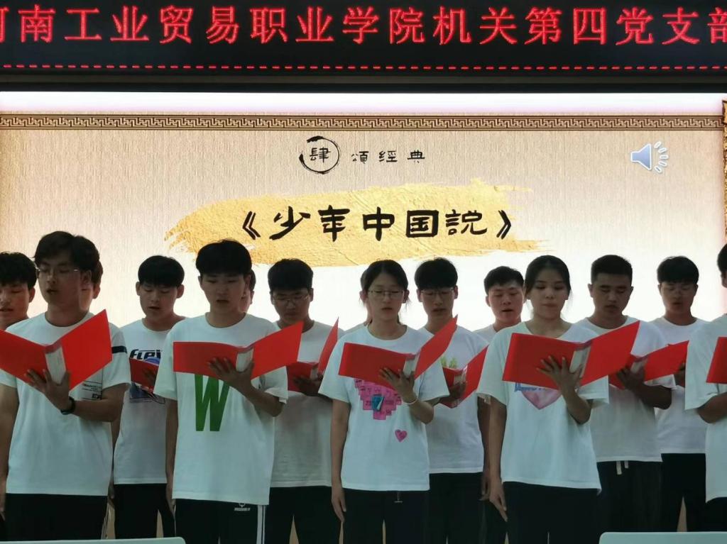 邀请我校财务会计学院和机电工程学院学生朗诵《少年中国说》。同学们个个精神抖擞、意气风发,以铿锵有力的朗诵,表达出梁启超先生“少年强,则国强”的精神内涵,展现了工贸学子昂扬向上的精神面貌,抒发了他们爱国爱家爱校的拳拳深情。