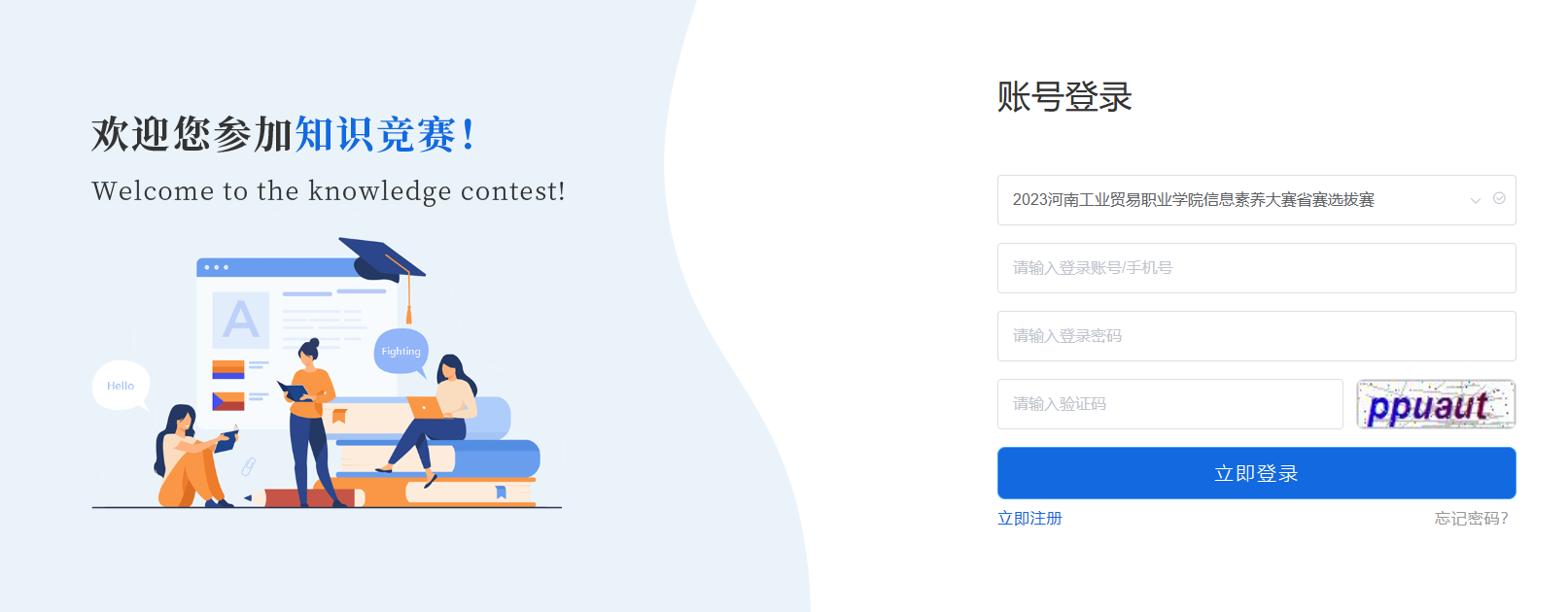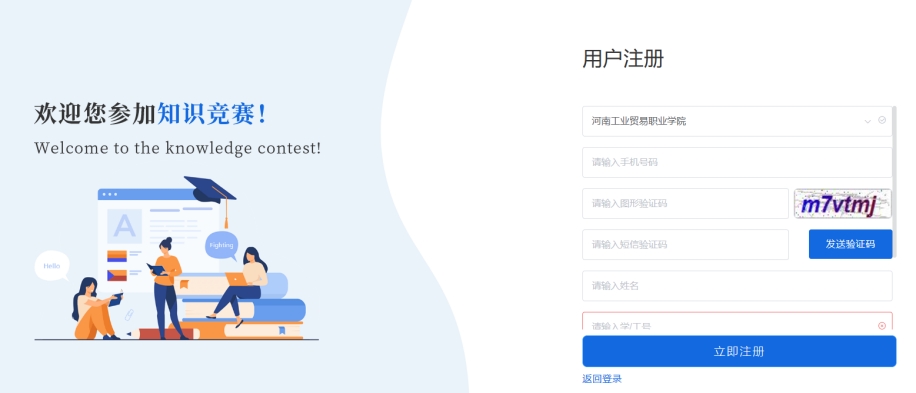 注册:参赛学生须在指定竞赛平台https://js.zhixinst.com/register?batchid=9ed94d01-bd9e-4a81-8109-fd37127e6385,选择机构“河南工业贸易职业学院”注册真实有效信息。