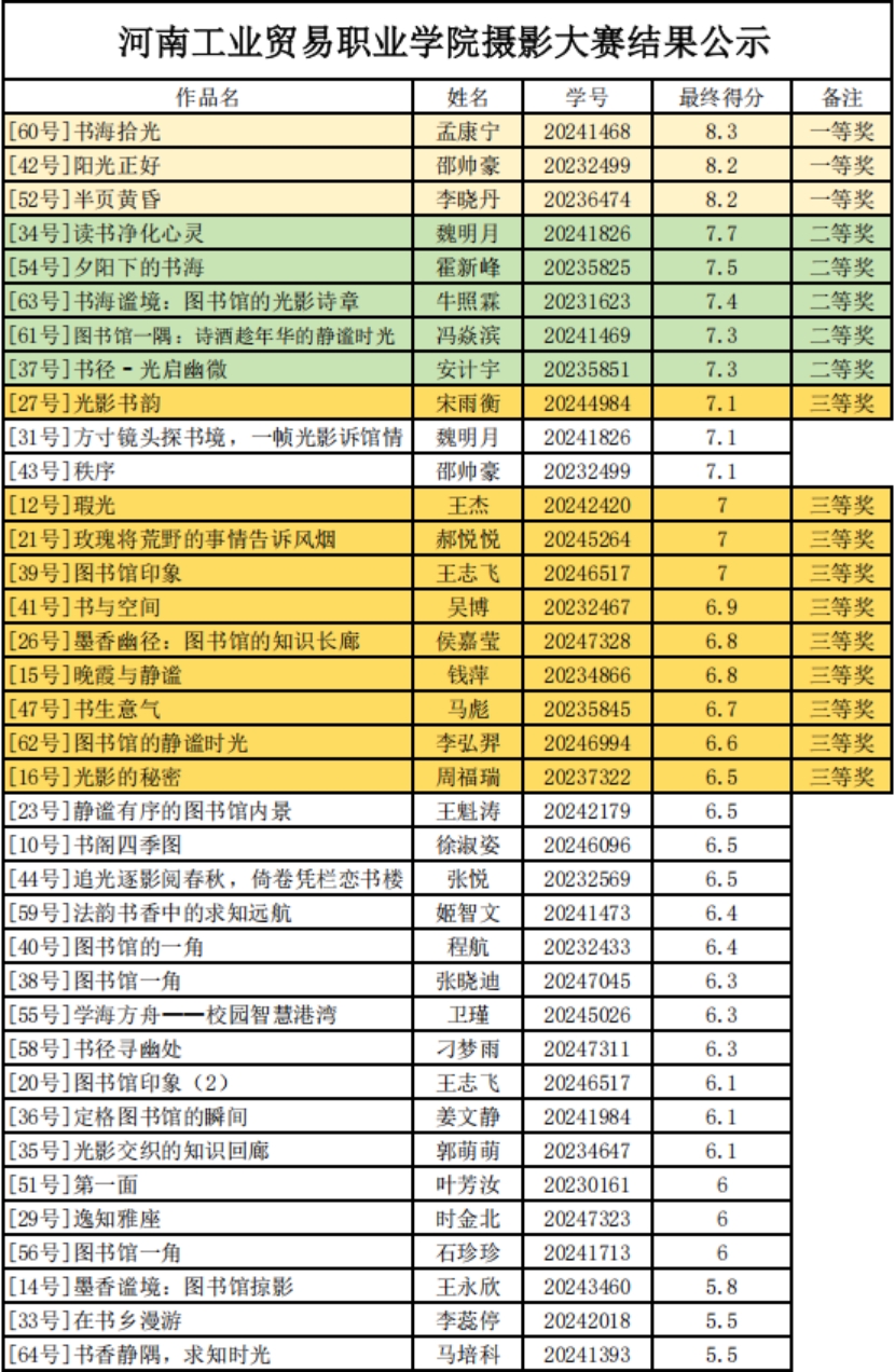 图书馆举办的摄影大赛已圆满结束。根据活动规则,评审小组从线上投票排名前40的作品中,结合创意、技术表现与感染力等因素进行了综合评分,评选出一、二、三等奖共18名,现将结果予以公示。
