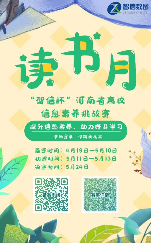 大赛已于4月19日正式启动,意向参赛的学生请关注图书馆网站《河南工业贸易职业学院关于组织开展第三届“智信杯”河南省高校信息素养挑战赛活动的通知》或到图书馆服务台了解大赛详情。