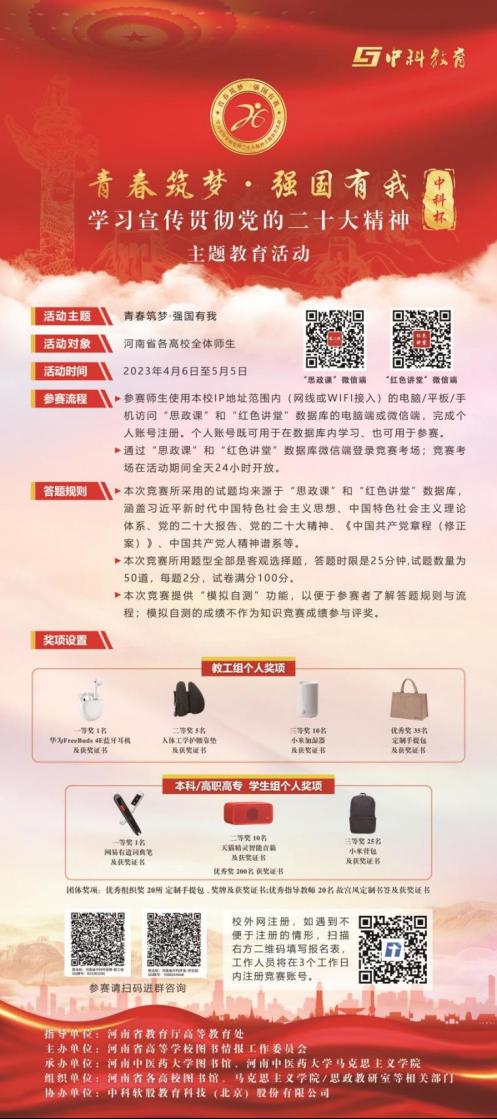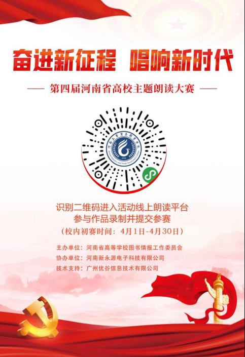 截止4月20日上午8:00时,第四届河南省高校主题朗读大赛,全省报名参赛人数已达3.1万人,我校已有734人报名参赛,目前位于全省第8名!该大赛将于4月30日结束,分为高校教师组、高校学生组,每人上传作品数量不限。倒计时10天,您无需等待!!!