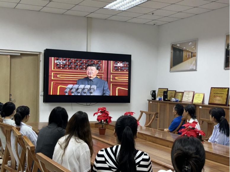 2025年9月3日上午,为铭记历史、缅怀先烈,弘扬伟大爱国主义精神和抗战精神,图书馆组织全体馆员在馆内会议室集中观看了纪念中国人民抗日战争暨世界反法西斯战争胜利80周年大会直播。