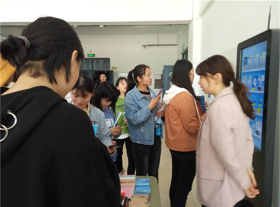 利用人流量大的下课时间,负责老师招呼过往同学来了解电子借阅机的使用、借阅机中电子资源的种类、更新频率,以及如何结合移动端超星学习通APP来进行电子资源泛在化使用。两个多小时的推介活动引来学生们的热切关注,同学们表示,充分利用我院电子资源,可以实现随时随地的阅读。