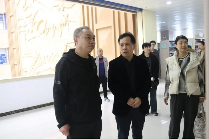 河南机电职业学院图文中心主任张斌,副主任孙金宝、赵吉文、范玉宁及相关科室主任对我校图书馆一行的到来表示热烈欢迎,并带领大家参观了图书馆的空间布局、浮雕文化、书画展览等。在参观过程中,孙长新对河南机电职业学院图书馆浓郁的文化氛围及丰富多彩的阅读推广活动表示赞赏,并认为这些经验和做法对我校图书馆的建设和发展具有重要的借鉴意义。