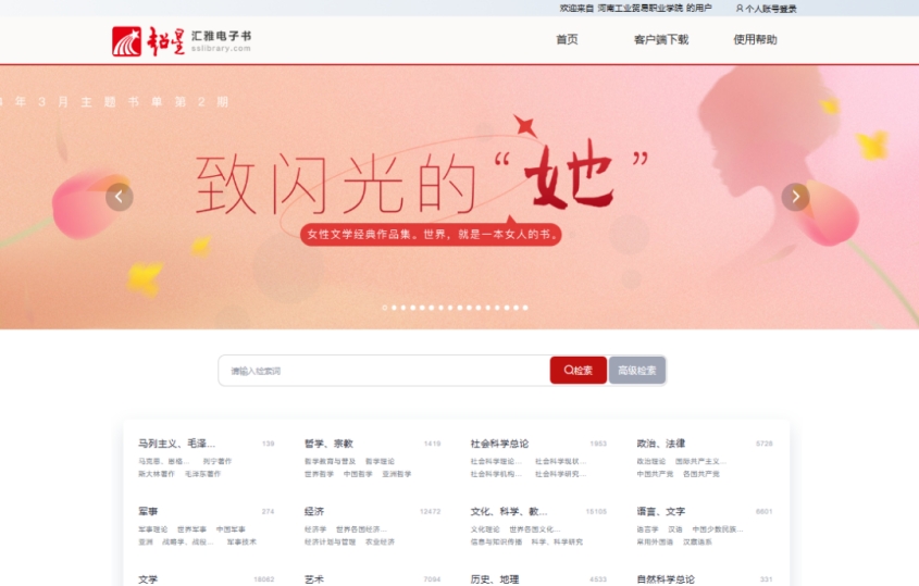 我校图书馆购买的超星电子图书数据库,涵盖中图分类法22个大类,拥有各类电子图书10余万种,是全球最大的中文电子图书资源库,学生可在学校校园网IP内直接登录阅读下载图书。