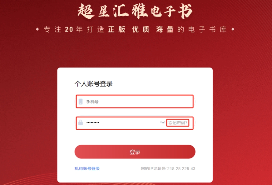 2.校外网访问:需要先在校园网IP内登录平台后,注册个人账号,然后读者即可在校外网登录账号进入。
