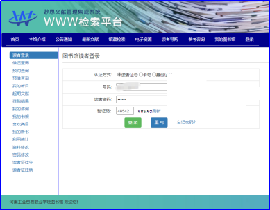 读者可在图书馆首页,找到“馆藏查询”栏目,点击进入到文献管理系统,登录此系统,进入“我的图书馆”,进行馆藏查询、读者借还查询、最新文献检索、电子资源查询、参考咨询等。