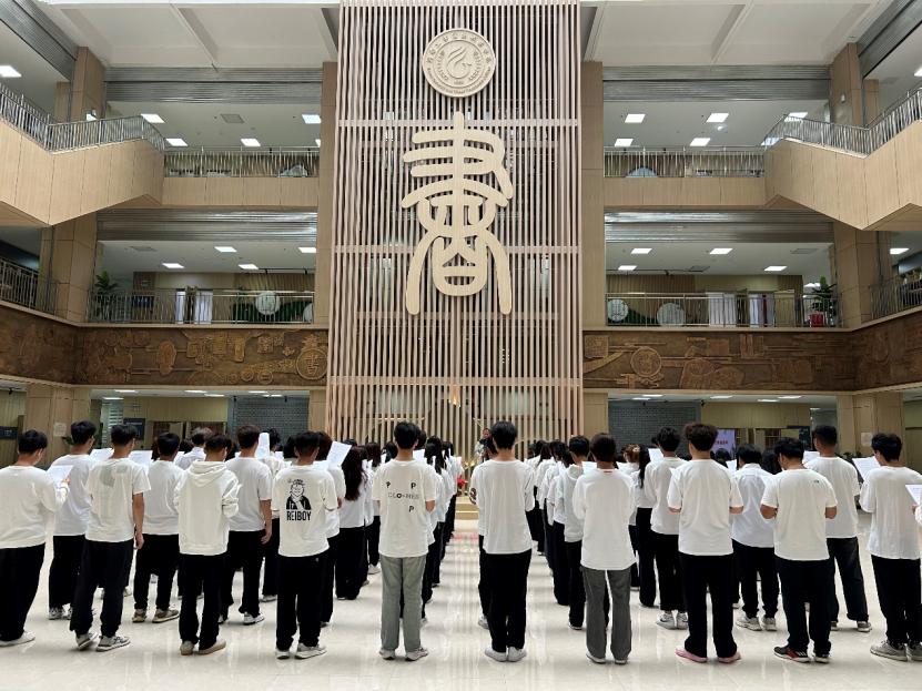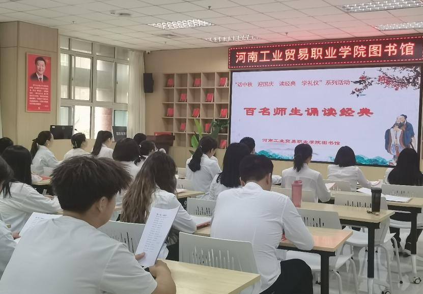 为认真学习宣传习近平文化思想,弘扬中华传统文化,丰富师生校园文化生活,10月13日下午,由河南工业贸易职业学院图书馆主办的“话中秋 迎国庆 读经典 学礼仪”系列活动之百名师生诵读经典在图书馆举行,全校百余名师生代表参加了诵读活动。