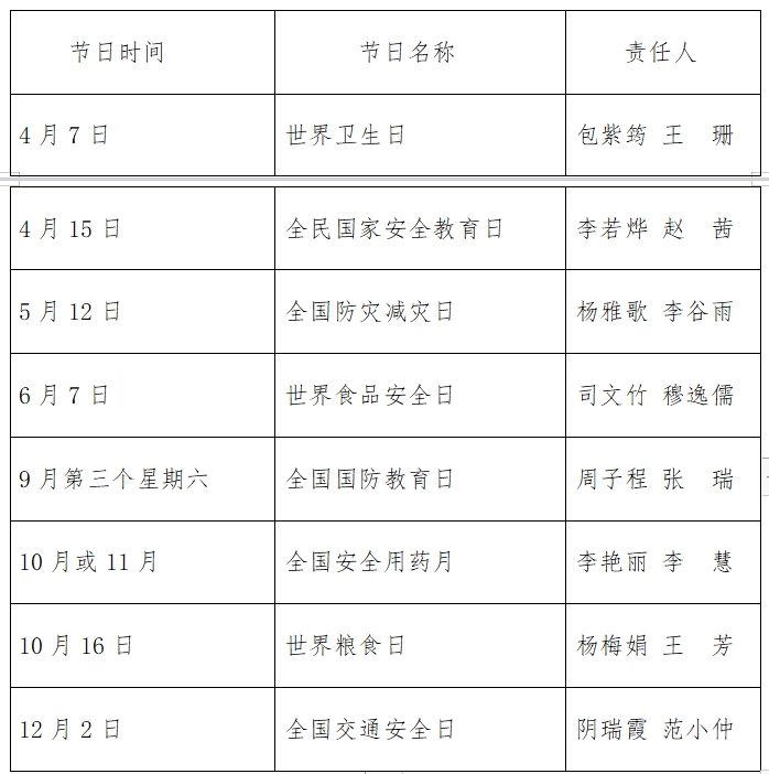 2022年4月-6月、9月-12月,具体节日宣传时间及责任人列表如下。