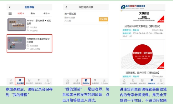【首页】【我的课程】【我的测试】【讲座培训】【个人中心】 ,以下是对应功能应用的图示操作流程。